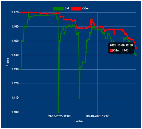 📌📉13,00 Hs Cotización del MULC – Dólar Divisa: Bid 1440,00 Offer 1445,00 cotización entre Bancos. 🚨 Está bajando (sin volumen) por la «hipotética expectativa», de auxilio de EEUU 👁️🗨️ Hay que tener cuidado, cuando los mercados se mueven por supuestos.
