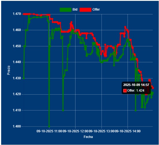 📌📉15,00 Hs Cierre del MULC – Dólar Divisa: Bid 1420,00 Offer 1424,00 cotización entre Bancos. 🚨 Se acentuó la baja, una vez que apareció en redes sociales, que se habría sellado el pacto entre 🇦🇷y🇺🇸: swap por USD 20.000 millones y plan anti-China. No descartamos que durante este FinDe XXL, surjan algunas adecuaciones de «regulaciones cambiarias»