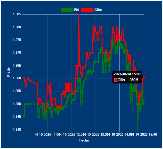 📌📉15,00 Hs Cierre del del MULC – Dólar Divisa: Bid 1351,00 Offer 1361,00 cotización entre Bancos. Si bien el MULC, convalidó nuestros parámetros que les compartimos, a ciencia cierta, aún no sabemos quien provocó la baja en la última hora. Evidentemente, el mercado de fondo, 📈es comprador. ¿Que vemos? un MULC haciendo piso, cada vez más altos