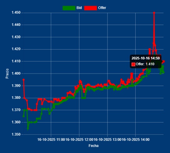 📌📈15,00 Hs Cierre del MULC – Dólar Divisa: Bid 1401,00 Offer 1410,00 cotización entre Bancos. El gráfico, habla por si solo. Entramos en los mismos valores del jueves pasado, cuando apareció del Tesoro 🇺🇸. Al no estar los AgroExportadores, ni el Tesoro de 🇦🇷, el mercado sabe qué, el único que abastece de Dólares es el Tesoro de 🇺🇸. Seguimos notando que de fondo, 📈es comprador.