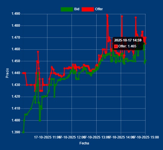 📌📈15,00 Hs Cierre del MULC – Dólar Divisa: Bid 1450,00 Offer 1465,00 cotización entre Bancos. Termina con volumen de USD 357 millones operado de divisas, donde estimamos que tuvo que haber vendido el Tesoro de 🇺🇸 casi USD 220 millones aproximadamente. Quedamos a $ 40,00 promedio, de $ 1489,00 (valor que vendería el BCRA)