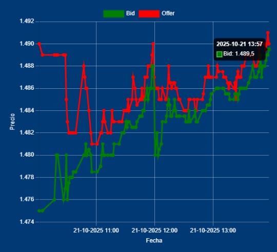 📌📈13,00 Hs Cotización del MULC – Dólar Divisa: Bid 1486,00 Offer 1487,00 cotización entre Bancos. $ 1490,00 Estamos muy cerca del techo, para que venda el BCRA.