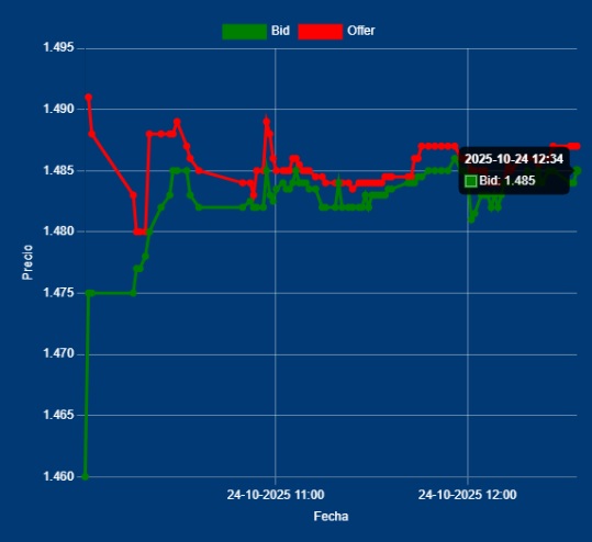 📌📈 12,30 Hs Cotización del MULC – Dólar Divisa: Bid 1485,00 Offer 1487,00 cotización entre Bancos. Se opera, entorno de estos valores. Si bien hay un poco más de EXPO, aún sigue la tendencia compradora de las IMPO. Hoy se cierra cambio, en función, a intuición de cada ejecutivo.