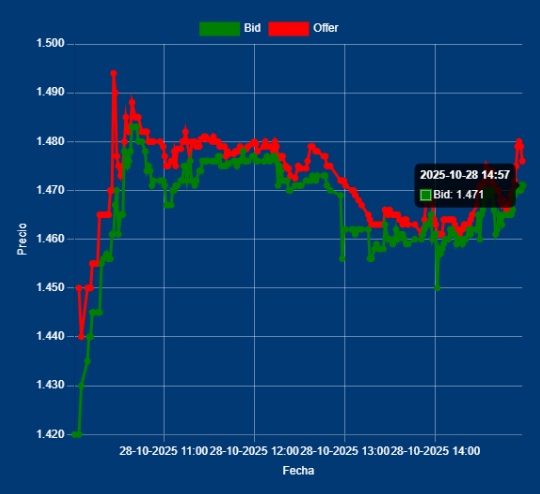 📌📈15,00 Hs Cierre del MULC – Dólar Divisa: Bid 1471,00 Offer 1476,00 cotización entre Bancos. USD 384 millones, fue el volumen genunino concertado en Comercio Exterior. Terminó, como al inicio. Y queda para mañana, comprador. Hay que tener en cuenta, que por estacionalidad, no hay suficientes divisas hasta que se inicie el ingreso de los Cerealistas Exportadores en DIC-2025, empezarían a liquidar la cosecha fina (trigo) y la gruesa en MAR-2026 (soja). Dependemos de los factores climáticos, de una buena cosecha y por ende, el ingreso de las divisas.