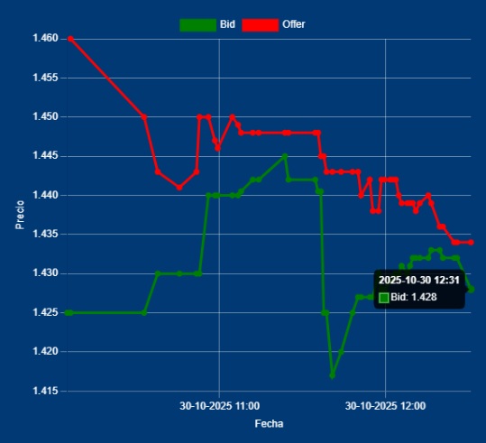 📌📉12,30 Hs Cotización del MULC – Dólar Divisa: Bid 1428,00 Offer 1434,00 cotización entre Bancos. El MULC no tiene la fuerza suficiente, para que suba. Sigue bajando las expectativas📉, para FIN NOV $ 1463,00 (ayer $ 1480,00) y FIN DIC $ 1495,00 (ayer $ 1512,00)