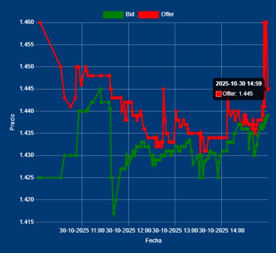 📌📈15,00 Hs Cierre del MULC – Dólar Divisa: Bid 1430,00 Offer 1445,00 cotización entre Bancos. Casi USD 120 millones de volumen de divisa (COMEX), Esto refleja, lo frágil que puede cambiar la tendencia, al no haber EXPO suficiente y generar volumen para cubrir las IMPO. Es decir, al haber movimiento, por ingresos (o egresos) por inversiones financieras, no miden nivel a operar, solo ejecutan la orden hasta cumplirla.