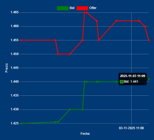 📌📈11,00 Hs Cotización del MULC – Dólar Divisa: Bid 1441,00 Offer 1455,00 cotización entre Bancos. Luego de un OCT, con mucha tensión cambiaria, iniciamos un NOV sin ese condimento, donde uno podría inferir sus estimaciones. Dato cierto: no habría una gran oferta de los AgroExportadores, hasta mediados de DIC-2025 con el inicio «estacional» de la liquidación de la cosecha fina🌾 y la cosecha gruesa 🫘 🌽sería en MAR-2026. Por tal motivo, no sería de extrañar, que la tendencia a mediano plazo, por no menos no sea vendedor. Hay que analizar, día por día.