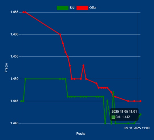 📌📉11,00 Hs Cotización del MULC – Dólar Divisa: Bid 1442,50 Offer 1445,00 cotización entre Bancos. Apertura vendedora, por el buen humor político y financiero. La proyecciones del Dólar a Futuro, están en posición vendedora. Son datos preliminares, dado que le volumen es muy bajo. Estimamos que pasadas las 12 hs., podremos ver una tendencia, más definida. Recordatorio: JUE 06-NOV no hay actividad bancaria. Es el Día del Trabajador Bancario.