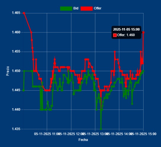 📌🔁15,00 Hs Cierre del MULC – Dólar Divisa: Bid 1450,00 Offer 1452,00 cotización entre Bancos. Si bien, al final, quedo 1460 el precio del offer, pero el cierre fue 1452,00. Volumen operado, fue un poco más de USD 200 millones de Divisas en COMEX Recordatorio: JUE 06-NOV no hay actividad bancaria. Es el Día del Trabajador Bancario.