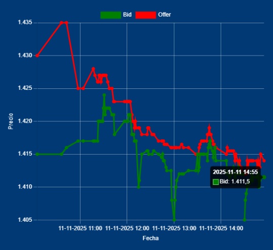 📌🔁11,00 Hs Cotización del MULC entre Bancos – Dólar Divisa: Bid 1410,00 – Offer 1415,00 MULC cauto, luego del feriado de ayer en EEUU. A priori, no da la sensación, que no tengamos las volatilidades de las semanas anteriores, pero por el buen humor bursátil, podríamos ver una MULC operándose entorno de 1400 a 1420. Off the records, el Tesoro 🇦🇷 no sería de extrañar que salga a comprar si cae por debajo de 1400,00 Ya lo hizo al día pos 26-O