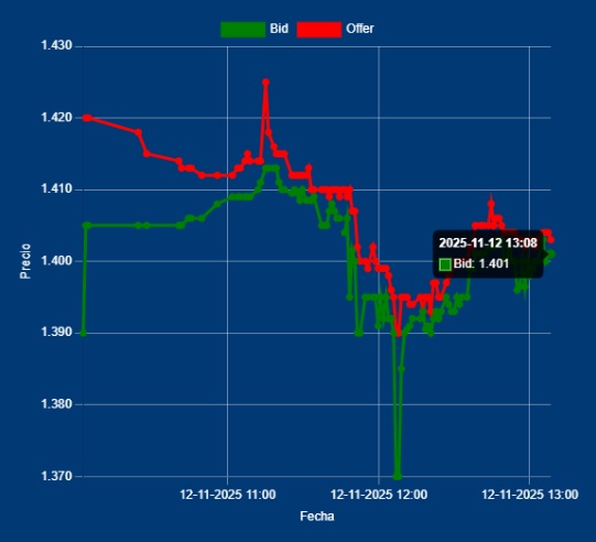📌🔁14,00 Hs Cotización del MULC entre Bancos – Dólar Divisa Bid 1403,00 – Offer 1404,00 MULC, está operando a un buen ritmo y volumen. Es un buen síntoma, donde en está última hora veremos si 1400 es un piso sólido. Caso contrario, el próximos piso, lo estaróamos viendo en 1350,00