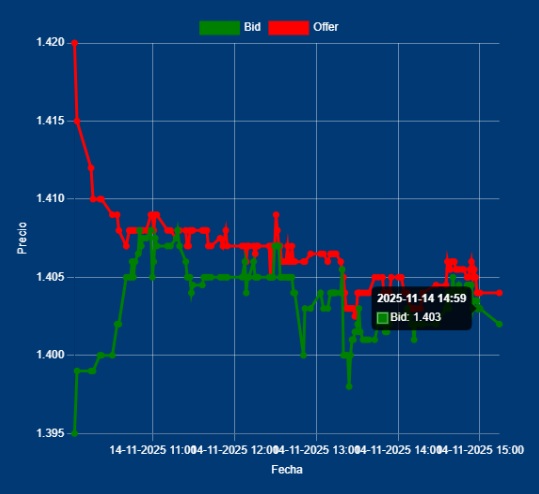 📌📉15,00 Hs Cierre del MULC entre Bancos – Dólar Divisa Bid 1403,00 – Offer 1404,00 Termina con un gran volumen, de USD 363 millones en COMEX. Por 3er día, está resistiendo el nivel de 1400. Detectamos un importante ingreso de dólares financieros, que están aportando a la oferta diaria y que están mutando a activos bursátiles. Al no haber tensión cambiaria, la demanda afloja, donde algunos están comprando para sus vacaciones.
