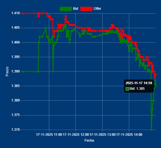 📌📉14,00 Hs Cotización del MULC entre Bancos – Dólar Divisa Bid 1397,00 – Offer 1401,00 Sin prisa, pero sin pausa, lentamente empieza a ceder. Dólar Futuro, siguen bajando lentamente. Fin Dic 1443 y Fin Ene 1479