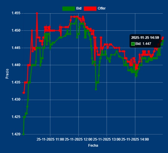 📌📈15,00 Hs Cierre del MULC entre Bancos – Dólar Divisa Bid 1447,00 – Offer 1448,00 Termina, como iniciamos la jornada. El MULC, absorbió la partida de USD 150 millones iniciales, donde termina con un volumen USD 330 millones de Divisas. Refleja, lo sensible y chico que es este MULC, ante la aparición de partidas de envergadura. En principio, quedaría comprador para mañana, donde a $1.508,98 debería vender el BCRA. Estaríamos a $ 61,00