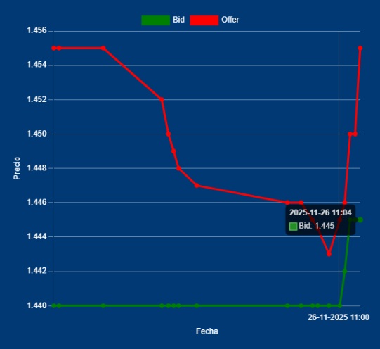 📌📈12,30 Hs Cotización del MULC entre Bancos – Dólar Divisa Bid 1450,00 – Offer 1455,00 Mantiene la tendencia, compradora. Donde vemos que hay IMPO que se están adelantando por el Feriado de mañana en🇺🇸. Hay muy poca EXPO, y recién entraría para fin de Dic, la cosecha fina de🌾trigo. Los primeros valores, en la apertura. Techo superior $1.508,98 debería vender el BCRA