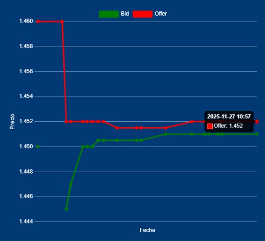 📌📉11,00 Hs Cotización del MULC entre Bancos – Dólar Divisa Bid 1451,00 – Offer 1452,00 Poco operativo, por el Feriado en 🇺🇸 Si bien son «cotizaciones indicativas» de referencia, no podemos detectar una tendencia. Parecería, reflejarse entorno en 1450 y 1455 en el MULC