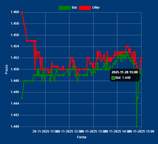 📌🔁15,00 Hs Cierre del MULC entre Bancos – Dólar Divisa Bid 1449,00 – Offer 1452,00 Cierra Nov con una variación del 0,45% y en los que va del 2025 es de un 40,65% Riesgo País: 651pb Reservas en el BCRA: bajan USD 1645 millones, cerrando en USD 40.314 millones. Tasa de Caución bursátil 20% a 7 días. Entramos en el último mes del 2025, con mucha expectativas tanto Cambiaria como Financiera
