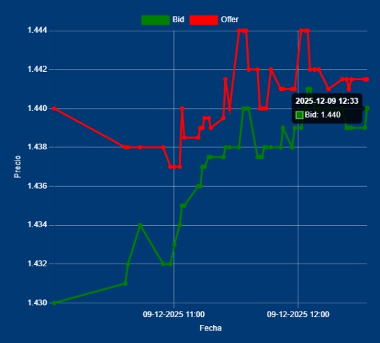 📌📈12,30 Hs Cotización del MULC entre Bancos – Dólar Divisa Bid 1440,00 – Offer 1442,00 El MULC, de fondo lo vemos comprador (o la menos, con poca oferta genuina de EXPO), pero estaría el BCRA, ejerciendo un control indirecto operando en los futuros. Hay que tener en cuanta qué, cuando se emite una Deuda Financiera con el Exterior, las divisas que ingresan en una cuenta del exterior del emisor, «no tiene la obligación de ingresarla al MULC», en tanto y en cuanto deseen pesificarla. (Según Texto Ordenado Pto. 2.4 de Exterior y Cambios)