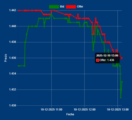 📌📉13,00 Hs Cotización del MULC entre Bancos – Dólar Divisa Bid 1433,00 – Offer 1436,00 Es como explicamos en el INFO de 12,30hs. El poco volumen operado, con la escasa participación tanto de EXPO como de IMPO, está provocando una baja al detectar ingreso de Dólares Financieros, donde el mundo financiero apuesta qué, si el Tesoro consigue una sobre oferta dólares vía deuda para pagar parte del AL29/30, se corre de la demanda en el MULC
