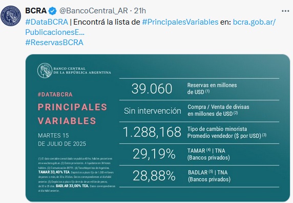 USD 39.141 millones📉Hoy, baja USD 81 millones las RESERVAS en el BCRA al 15-JUL: Sin intervención